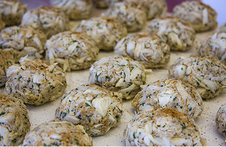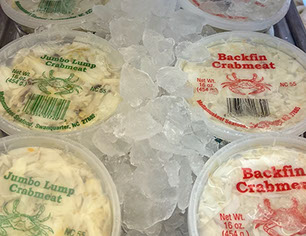 Clams, Blue Crabs, Crabmeat (Jumbo/Lump/Backfin), Softshell Crabs, Snow Crab Legs, King Crab Legs, Jonah Crab Claws, Dungeness Crabs, Deviled Crabs, Crab Cakes, Crawfish, Live Lobster, Lobster Tails, Ocean Scallops, Bay Scallops, Bacon-Wrapped Scallops, Oysters (pint & in shell), Shrimp and other items in season.